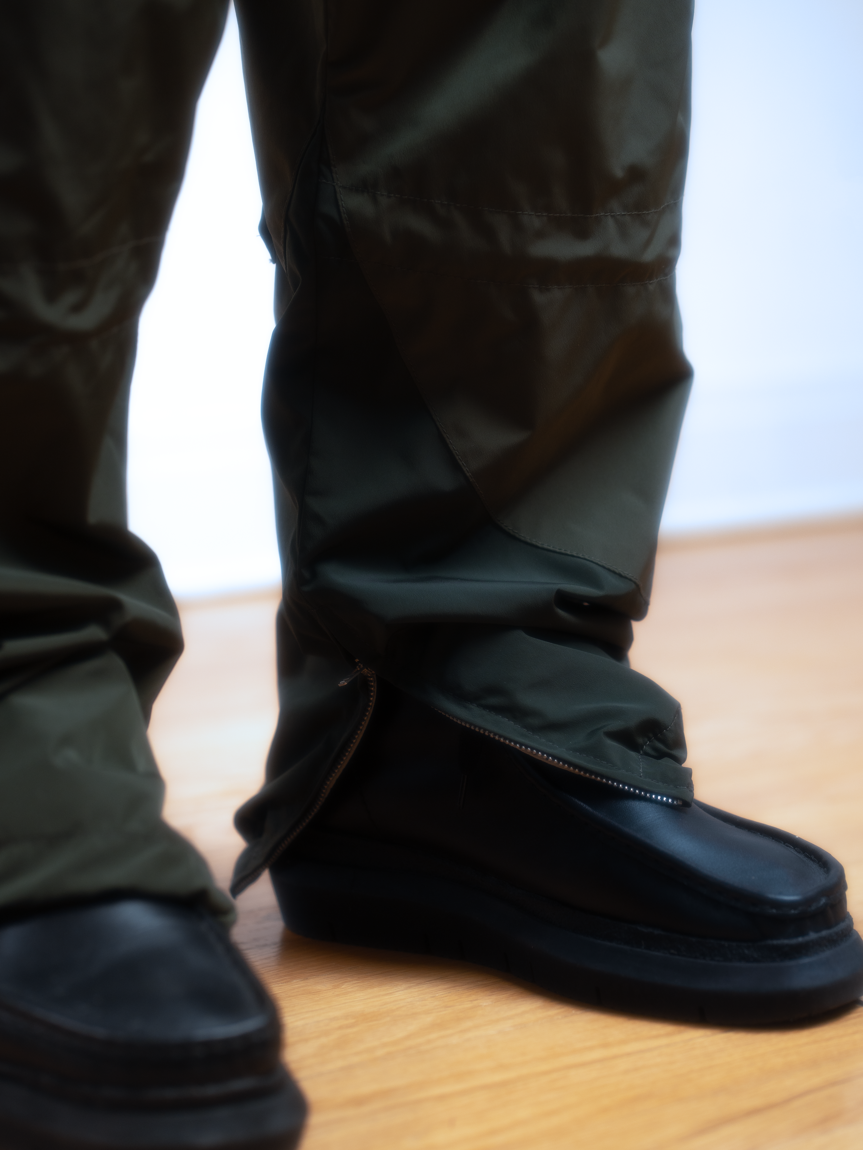 6 cinch pulls at thigh, shin, and ankle enabling control of silhouette